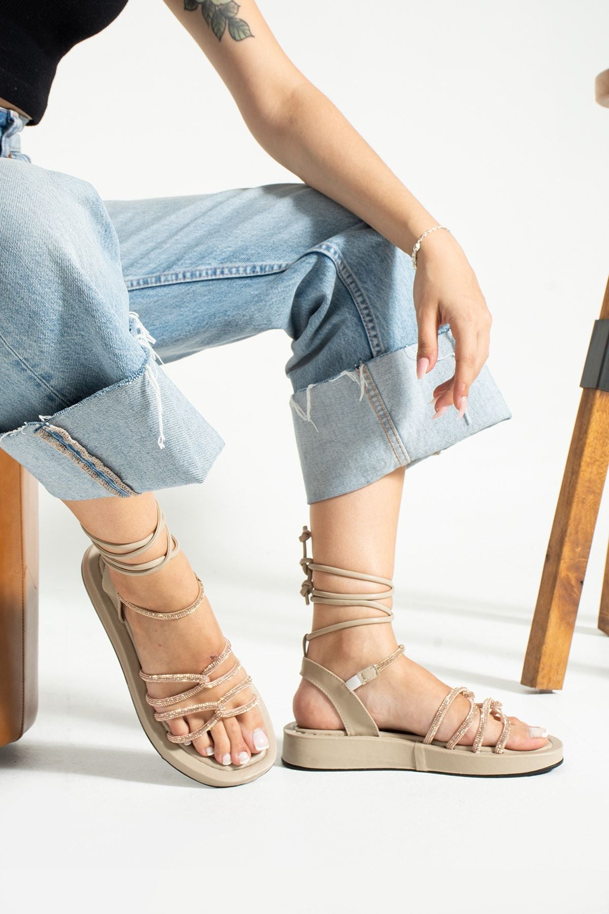 Kadın Şerit Taş Detaylı Hafif Ortopedik Ipli Taşlı Sandalet